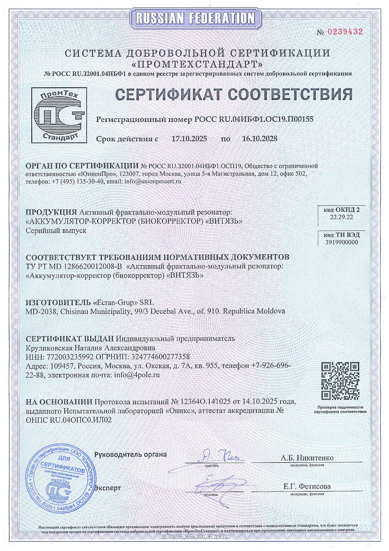 Сертификат «Об открытии поляризации неионизирующих излучений человека, растений, животных и технических средств»