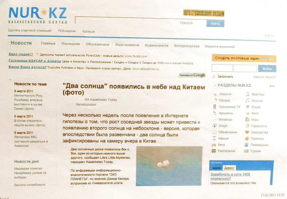 8 марта 2011 года была получена фотография «двух» Солнц, а взрыв произошел 12 марта. Явление видимости второго Солнца произошло потому, что из дна океана из-за разлома в земной коре в районе Японии вышел в виде прожектора луч микролептонного излучения левой поляризации.